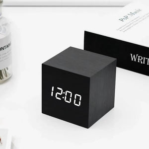 Add style to your bedside or office desk with this cube alarm clock. This alarm clock is multifunctional with its snooze feature, temperature display and alarm settings. Choose from 4 different colours on a faux wood-grain base, this compact clock is ideal for those small spaces.