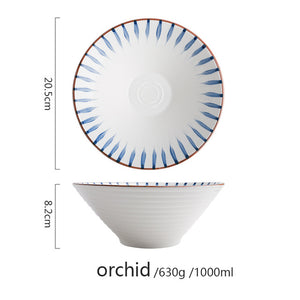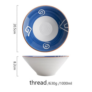 Ceramic noodle bowls with Japanese-inspired detailing. With a unique cone-shape, these bowls are extra deep and allows you to fill up with more goodies. Available in three different patterns with a matte ribbed outing.
